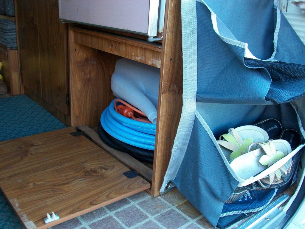 Ok, Have had a busy day, but managed to get some photos of the new storage space. Also the cupboard under the fridge holds the hoses, electrical lead and watering can. I'm wondering if I should put the hoses and electirical lead in the bag with the awning and ground sheet to put up in the outside well storage space.