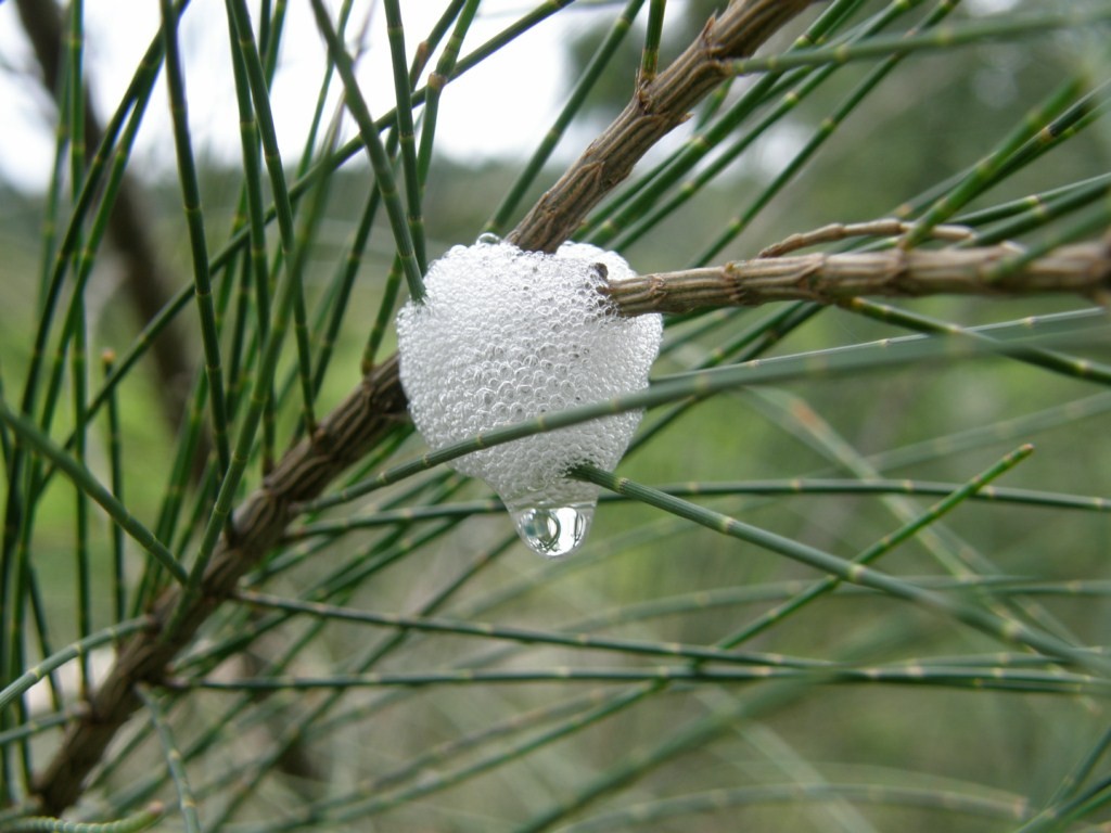 That spit in the tree, has it got something to do with frogs, maybe a froth of frogs eggs. Its very unusual but certainly something left behind by an animal. Like caviar or roe from fish.