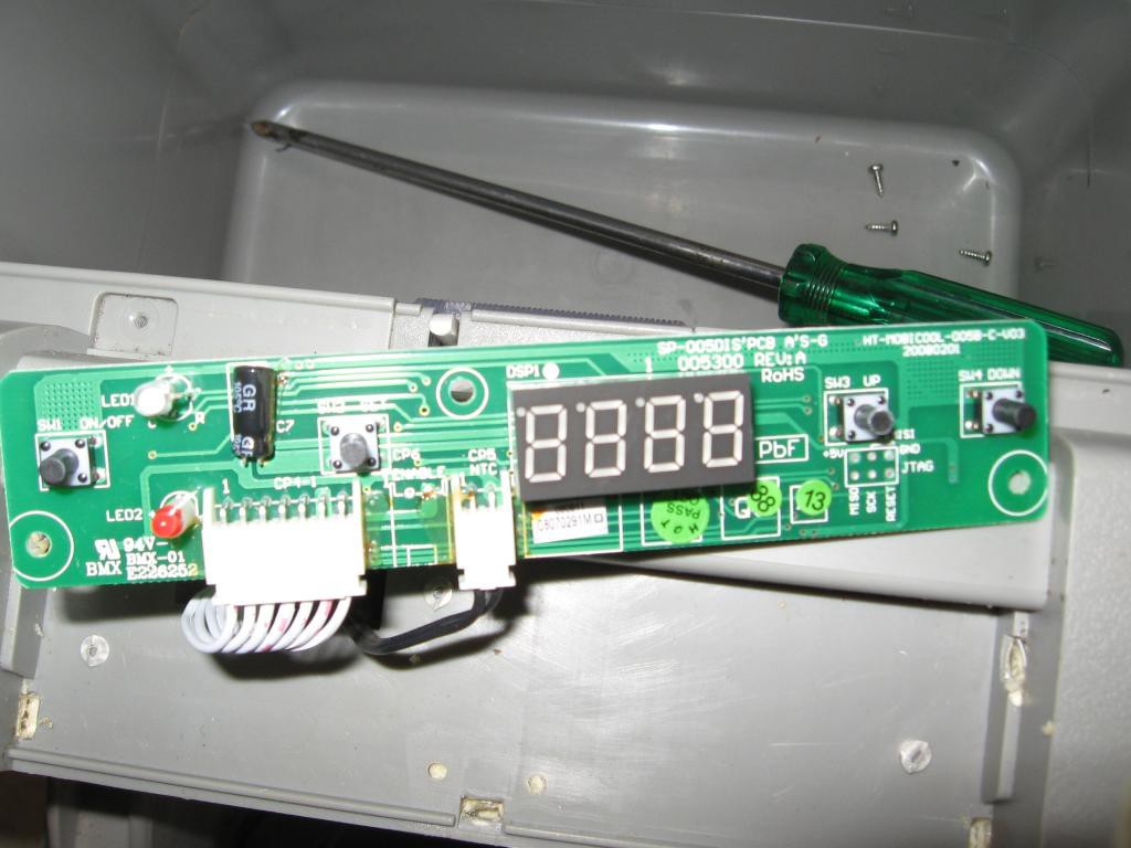 The CF-40AC Ver b is diferent again. All the processor is up in the control panel, & is surface mount components. Rather difficult to repair , apart from replacing thermistor or push button switches. Are these the same control panel as yours? CP5 NTC on the board is where the thermistor plugs in, I would unplug it & check the resistance. An easy check is plug a good thermistor into the board & see if the temperature is more realistic.