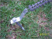 Have a look at my photo on 'easy in,easy out' - which is really Screw In Tent Pegs Take 1. I use washers attached to the trace springs, the peg goes through the hole in the middle. Cheap and easy, no cutting, welding, machine work - just drill one small hole.