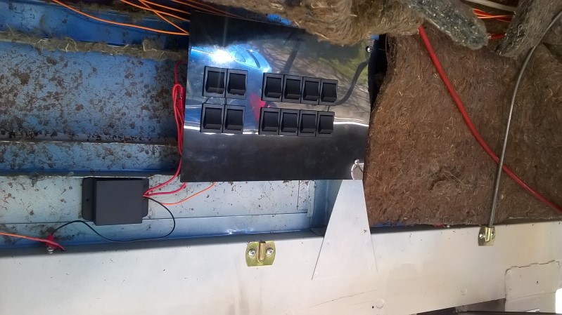 The beginnings of the control center, just above the side entry door. All the lights and fans are individually switched. The black box below the panel is the box containing the light activated switch circuit I built for the vent fans.