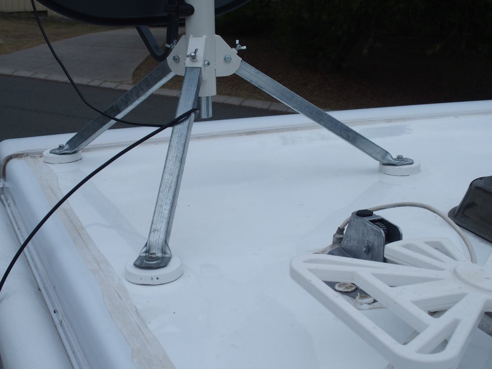 Mounted these feet on the roof of the van this weekend, PVC end caps tapped with an 8mm bolt and filled with fiberglass. Its not very hard to get the tripod and then the dish up there, cures the theft problem. Unit is from Access Antennas.