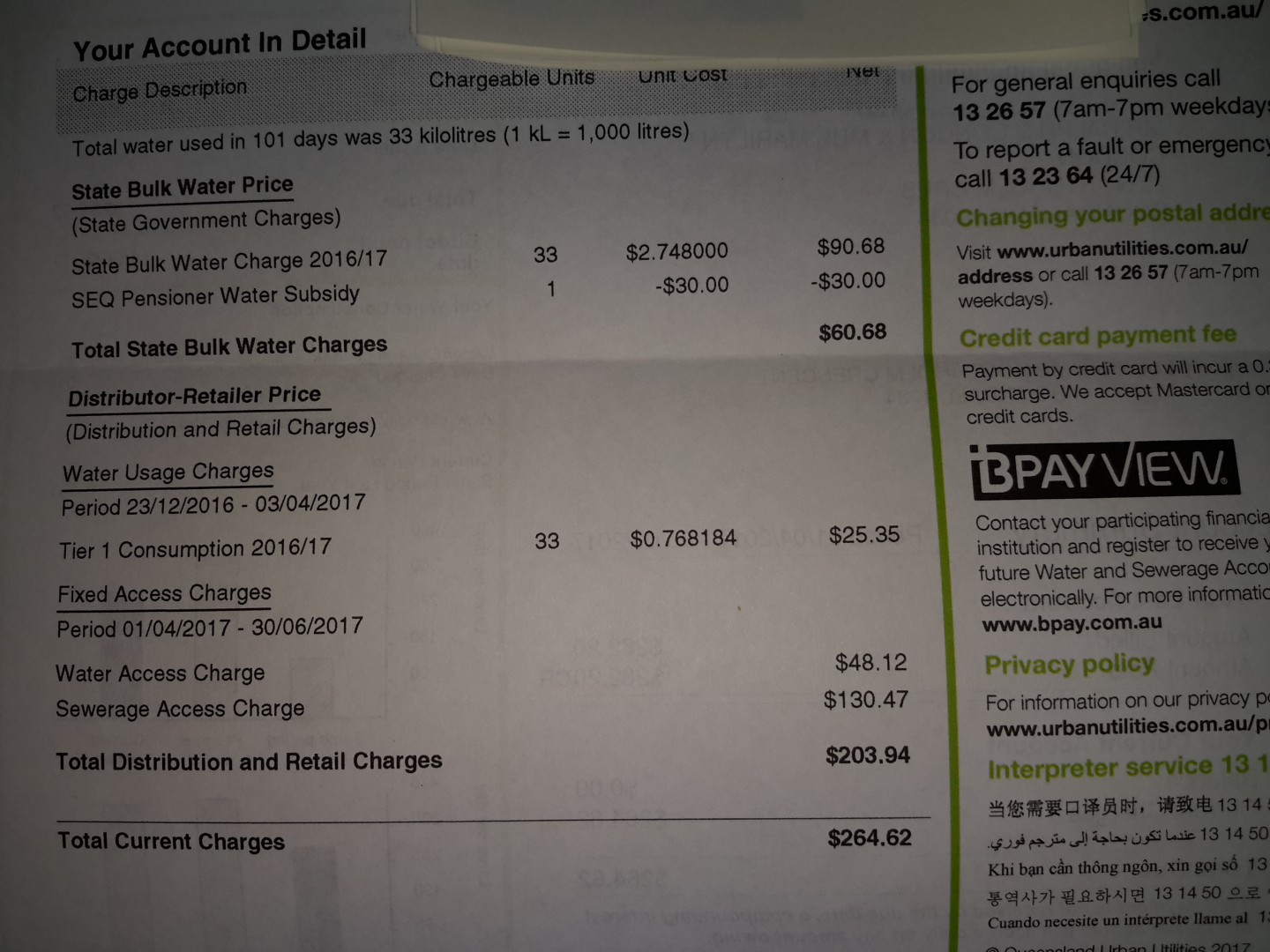 Now my pie in the sky would be if the utilities providers would pro rater me the difference when I am away. 14 weeks we have been away so far this year, the previous account was much the same, of the $264 only $25 was for water, that would of been when we filled the tanks, was the car and caravan, had a shower, took off again.