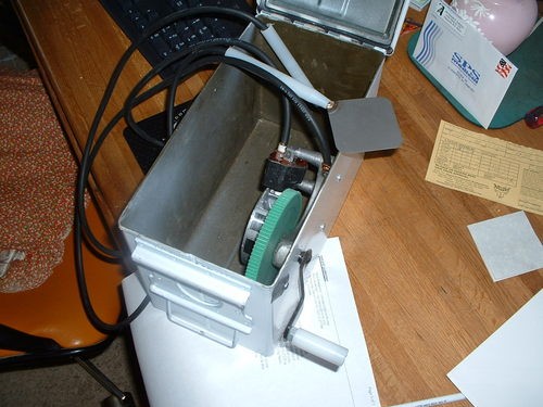 This is the shocking device which we used on the farm in the US. It is a weed eater magneto with a gear and a hand crank, delivering the shock to the leads.
