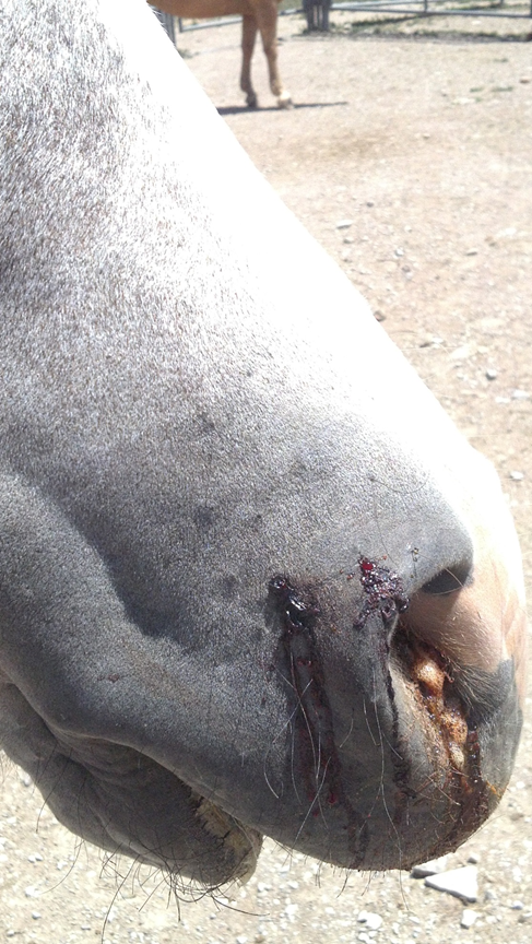 Picture of the same horse 5 days later, you can see the pink spot on the nostril where one fang mark was. The lip and face are now normal with no tissue damage.