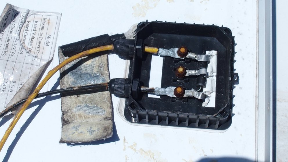 Three pictures, the first showing the junction box under the solar panel, lid having had the locating legs broken off it, and the lid gaffa tapped in position. This panel the lid was missing and the items inside are all corroded. The other panel I noticed the gaffa tape early and did some repairs to salvage the box, so still had a lid for that side. Both boxes had gaffa tape to secure the lid, thanks Jayco.