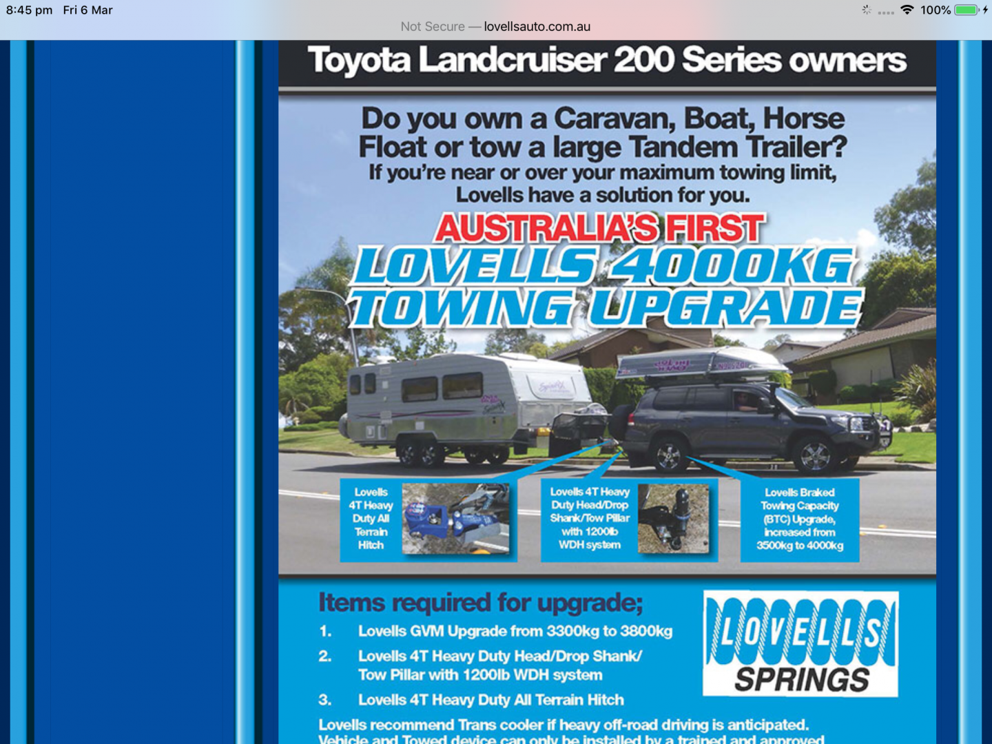 Firstly I was not aware that Lovells would do an ATM upgrade on a caravan and I believe there is a question mark over towing 4 tonne behind a 200 series cruiser upgrade or not.