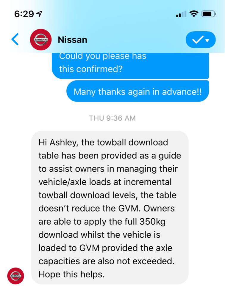 Hmmm.Sorry,but I would tend to believe specifications published on the official Nissan website than I would a few words in a text message from who knows where?The problem of the reduction in GVM has been known for years,and can't be changed by a few words in a text message from an apparently unidentified individual.Any correspondence on a matter as important as this would surely be more plausible if it was on an official Nissan letterhead,or was able to be viewed on the Nissan website? "Provided as a guide to assist owners in managing their vehicle/axle loads at incremental towball download levels". What a lot of garbage.If the GVM is not affected,why would Nissan even bother posting relevant figures on the website,as doing so would only further confuse those amongst us who have little understanding of weights,surely? And saying that you are "able to apply the full 350kg download whilst the vehicle is loaded to GVM" is very convenient,but does not acknowledge the fact that the GVM has been reduced by 130kg,to 3370kg.If they published,on their website,that the FULL 3500kg was able to be used when a 350kg towball weight is applied,then it would have credibility.Cheers