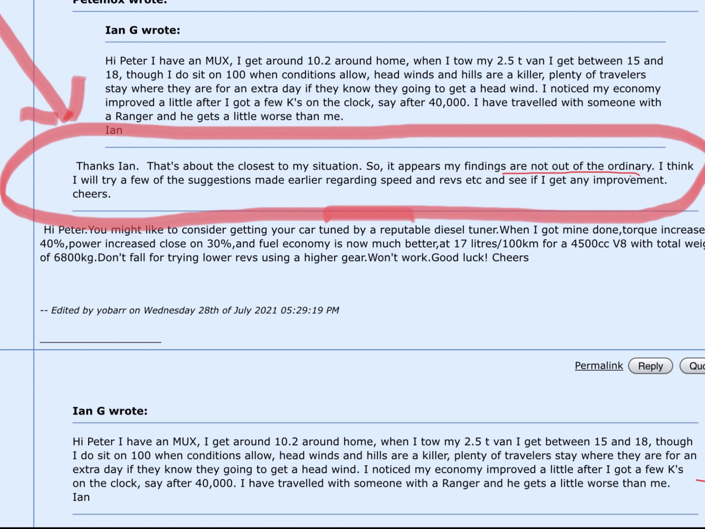 Hi Peter I have an MUX, I get around 10.2 around home, when I tow my 2.5 t van I get between 15 and 18, though I do sit on 100 when conditions allow, head winds and hills are a killer, plenty of travelers stay where they are for an extra day if they know they going to get a head wind. I noticed my economy improved a little after I got a few K's on the clock, say after 40,000. I have travelled with someone with a Ranger and he gets a little worse than me.