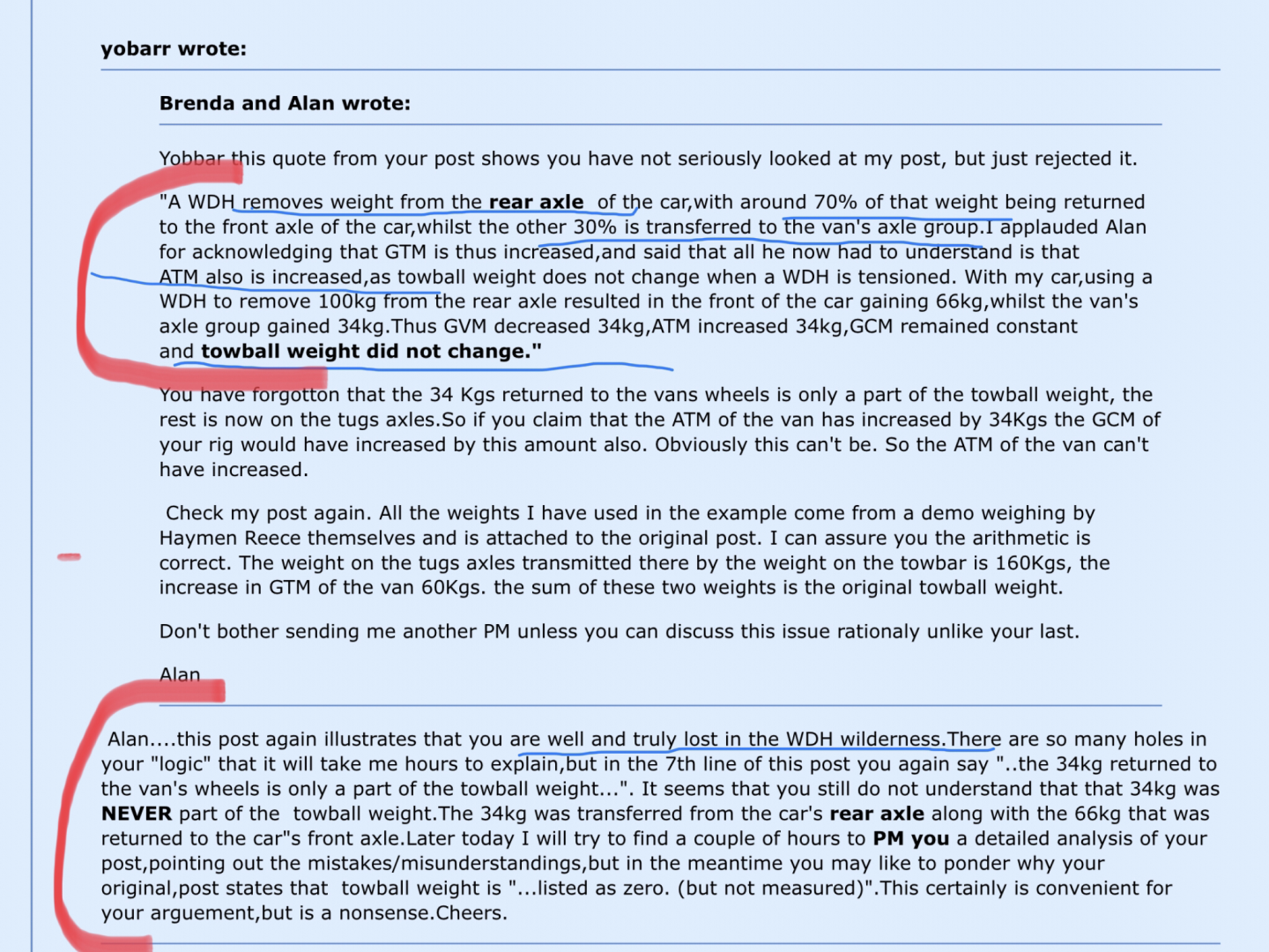 Not again! Alan, I have spent many hours documenting stuff for you, including copies of information from the Hayman Reese website, ALL of which showed that a WDH DOES NOT change towball weight, and because I did all this for you more than 2 years ago I thought that finally you'd woken up. Apparently not, but I simply can't be bothered iterating it for you. If you haven't learnt by now, it's unlikely that you ever will. You can take a horse to water but you can't make it drink. To help you, without to much more effort, I have posted screenshots of both a PM to you and a post from the forum, along with another suggestion that you Google "Weight distribution and load levelling hitches for heavy towing" by John Cadogan. You might like to access books written by Collyn Rivers, a noted expert on weights and dynamics, with over 60 years experience in this field, and a world recognised expert. Should you STILL fail to understand I suggest that you write to both Collyn Rivers and Hayman Reese and point out to them the error of their ways. You woukd no doubt then be happy to post copies of their correspondence with you, acknowledging that after 50 years in the business of weight distribution, they still know little? Cheers