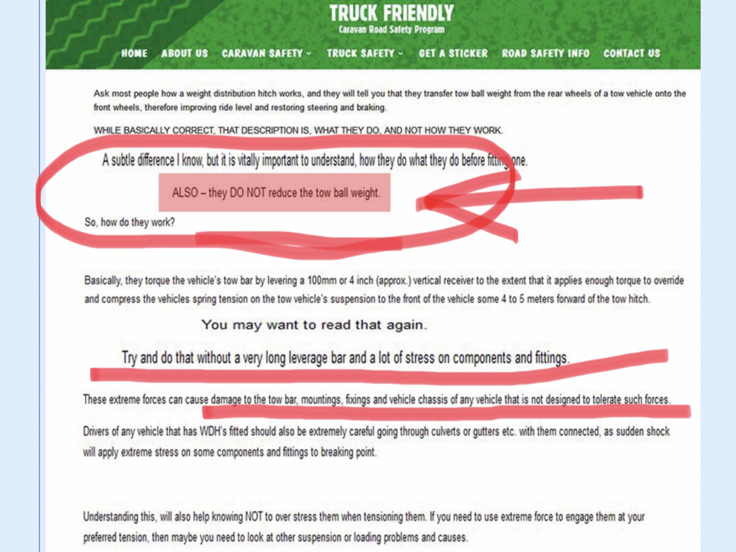 Hi Stephen. Despite me spending many, many hours on the forum explaining the workings of a WDH, along with relevant screenshots from the Hayman Reese website and advice on how to access relevant videos, combined with results from my own weighings on a registered weighbridge, still it seems that some don't want to know. It is an INDESPUTABLE fact that a WDH DOES NOT CHANGE TOWBALL WEIGHT. Never has. Never will. No matter how some may waffle-on, and come up with their own half-baked theories there is no disputing what Hayman Reese says, nor the findings by Collyn Rivers who has 60 years experience with weights and dynamics. It is very easy to access his books online, as it also is easy to access the HR website. Since I joined this forum many have come to understand that when it comes to weights I do know what I'm talking about, but still there seem to be some who learn slowly or who just don't want to know. C'est la vie. Again I will suggest that you Google John Cadogan "Weight distribution and load levelling hitches for heavy towing" and make an effort to actively LISTEN to the lesson. If you then still do not understand it appears that there is little that can be done to help you. Cheers