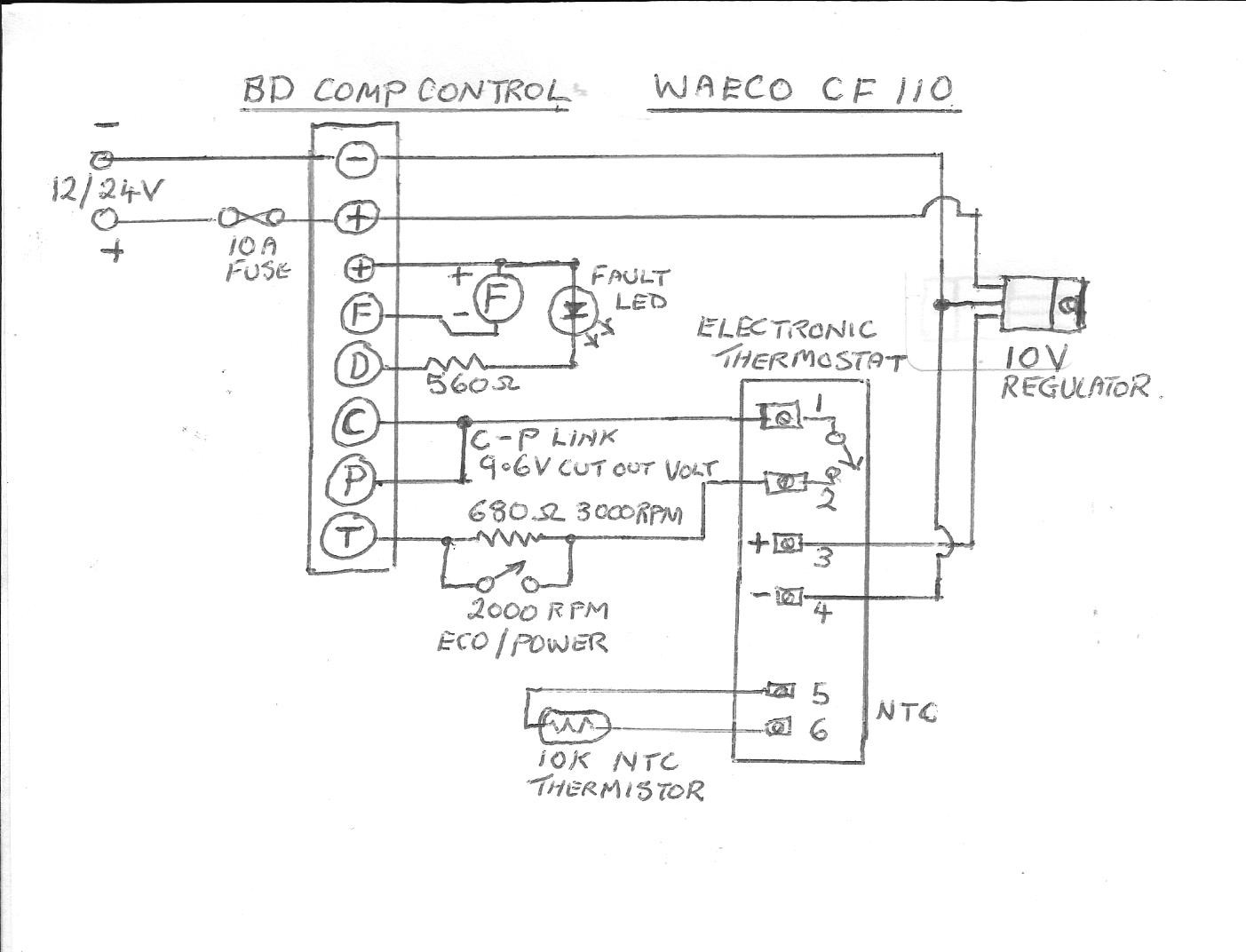 Waeco CoolFreeze CF-110 Main PCB (028221 Rev:A) U3 = EM78P458AP U4 = AT24C02 VCC ___ | |_____________ | | | | | | .------. | .-. | 16 | | | | R14 Q2 <----|1 | | | | | 20|--| '-' Q1 <----|2 | | VCC | 19|--------+---o CP6-4 Turbo SW --- | | | | | C5 .-. | | || Thermistor R8 | | | 18|-----+-----||--> GND NTC | | | | X1 | || | '-' | | _-_ _V_ CP4-2 | | | |___|3.58 MHz |--|___|---------o---+-------------|3 | - |----------------o---+ | | | || CP4-1 | | 17|-----+-----||--> GND === | | || C6 Temperature GND | | Display | | CP6-3 o---| Enable VCC o-------|4 15|------------o CP6-8 Power LED (bicolour) | | | \| ___ | | VCC Q4 |---------------|___|-------|6 | --- <| R9 | | | | VCC | | +-+--+ | --- | | | | === | | U3 | .-. .-. GND +--------+---+ | | | | | | | | | | | | | | | R16 | .-. .-. | | '-' '-' U4 | R18| | | | R19 | | |R17 | __ | | | | | | 14|---+----)---o CP6-9 Temp SW .-o|1 |o-' '-' '-' | | | |-o| |o---> GND | | | 13|--------+---o CP6-10 On/Off SW |-o| |o----------+---)-------|7 | |-o|__|o--------------+-------|8 | | | | | 24C02 CP6-1 o--------|9 12|------------> GND | Display Clock | | === | 11|------------o CP6-7 Power LED (bicolour) GND CP6-2 o--------|10 | Temperature | 5 | Display Data '------' | | === GND (created by AACircuit v1.28.7 beta 02/28/13 www.tech-chat.de)Thanks again for the input...