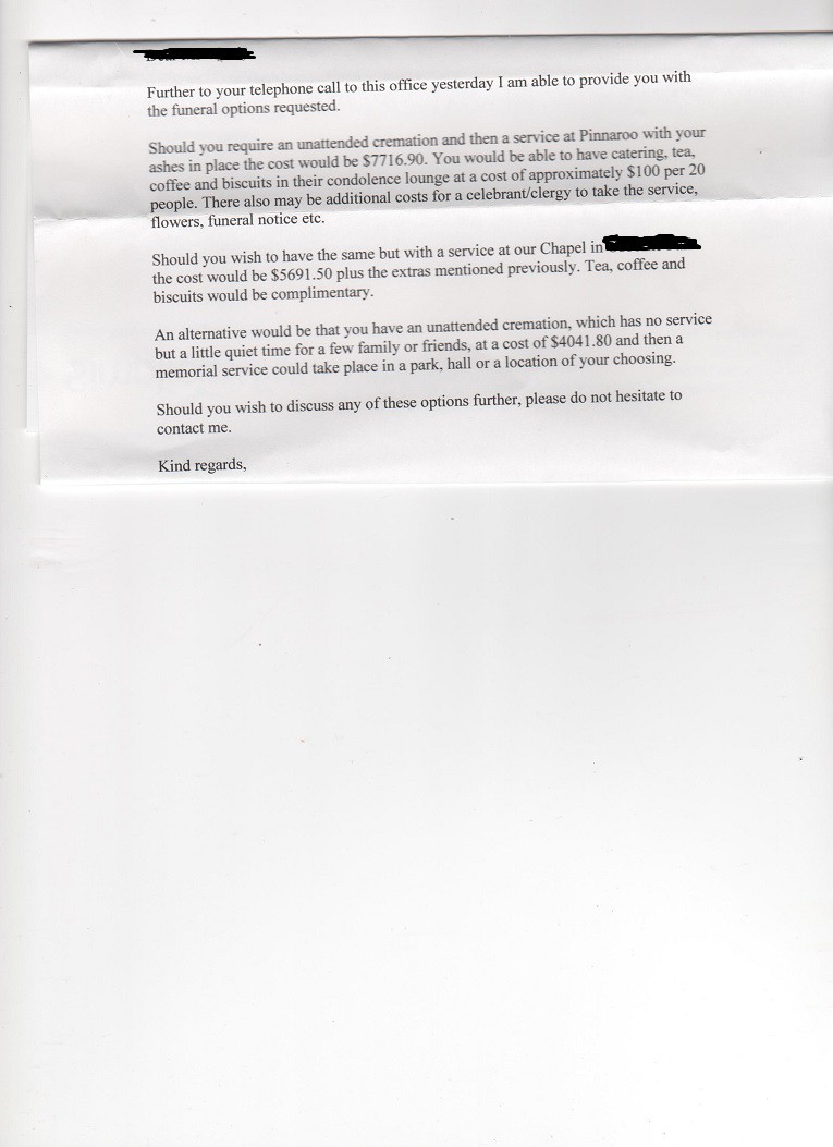For Wombat, I am thinking of prepaid for the funeral director to do paperwork/death certificate, cheapest coffin, pick up and transport body from place of death for cremation (I would imagine storage until cremation can be done), transport to cremation.
