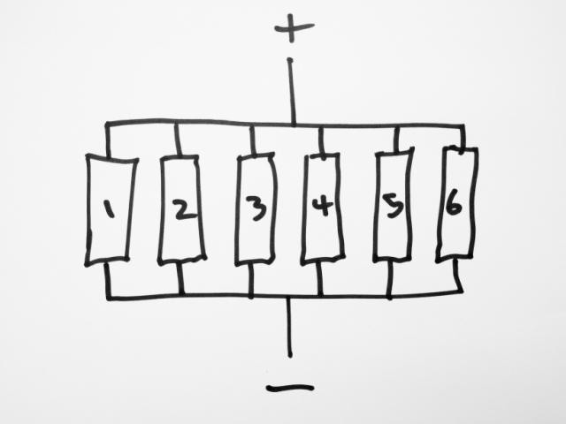 Next, link the output of panel 1 and panel 4 in parallel, the same for panel 2 and panel 5 and finally, panel 3 and panel 6. This will deliver the most possible output from the 2 series/parallel strings because both series strings have their panels balanced with the other string. This way, a shadow on one panel will not drop the voltage of that string to less than the voltage of the other string, both strings will see the same voltage and perform at their best accounting for the loss of 1 panel.