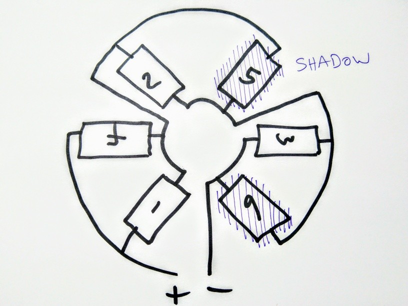 .-------. .-------. -> -> .-------. Imp | |Imp| |Imp 2Imp| | 2Imp .-| #1 |-+-| #2 |----+-----| #3 |----. | | | | | | | ^ | | | 0V o---+ '-------' | '-------' | | '-------' +---o + 3Vmp | .-------. | .-------. | Imp .-------. | 2Imp | | | | | | -> | |///////| | 2Imp '-| #4 |-+-| #5 |----+-----|//#6 //|----' Imp | |Imp| |Imp I=0 |///////| I=0 '-------' '-------' '-------' --> --> --> +Vmp +Vmp +Vmp... but clearly this is absurd because the output of the array would be 3 Vmp x 2 Imp = 6 x Vmp x Imp. That is, 5 panels would now be producing the same output as 6 panels. So what really happens in practice?