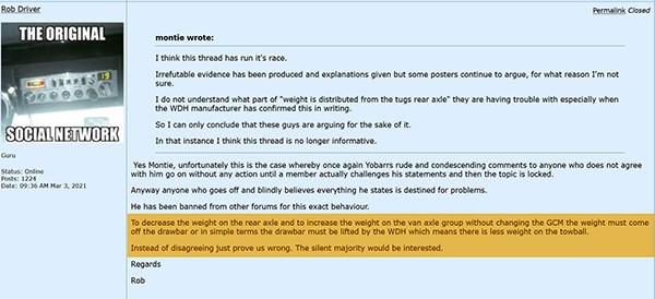 I am truly amazed that you can find an old post of mine (as you claim) within minutes of me posting but you cannot produce a post of your own whereby you claim you have proved on a weigh bridge that the drawbar weight or part thereof, does not transfer to the front axle of the tow vehicle and the axle group of the van.