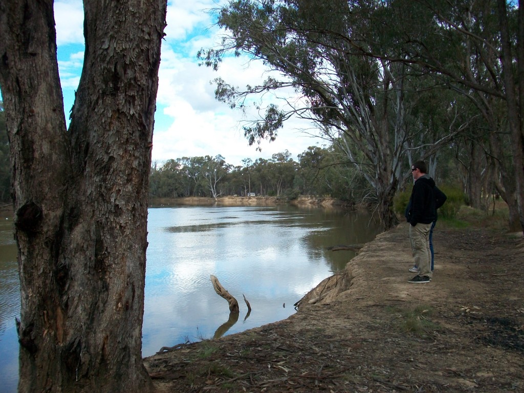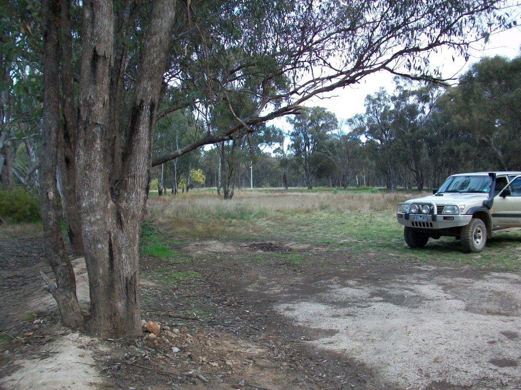 You turn right between pub and petrol station which by the way you can get a fishing license from. Cross over the bridge and travel about 7 ks. Just before the boat ramp, (about 20 metres) turn right into the Gunbower National Park, take the 1st turn left ( the others are a bit damp at the moment but will be dry by November) And drive along a track through some trees to the banks of the Murray River.