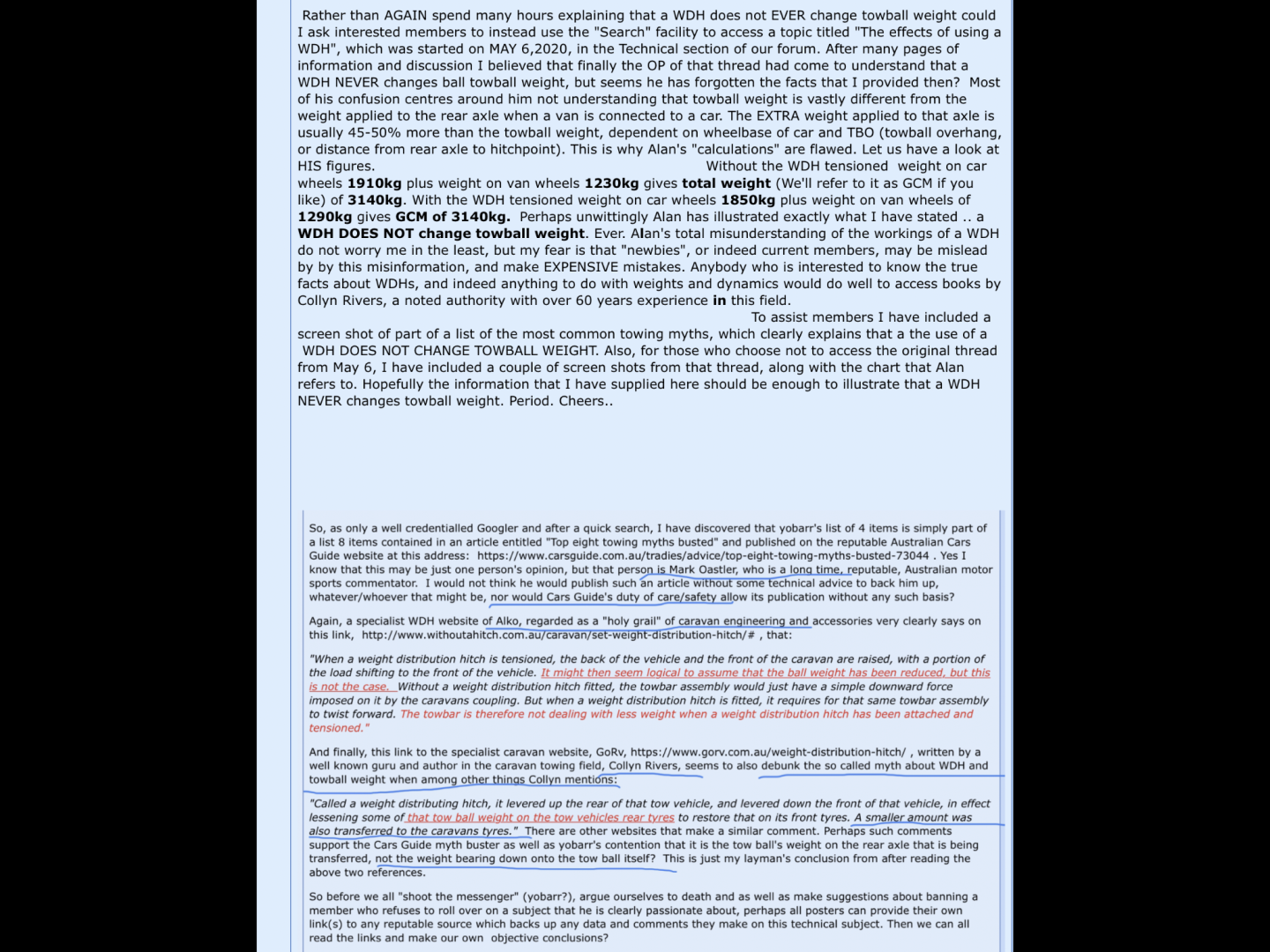 Alan, might I respectfully suggest that you stop posting rubbish about WDH systems, and that you give up on trying to change the laws of physics. All you're doing is causing doubt among some of our members who do not fully understand how a WDH works. You initiated this tripe over 2 years ago, and I , along with several other members, posted pages of information and facts in an effort to help you to understand that you were wrong. Because we had heard nothing further from you I believed that finally you'd seen the light. Now, 2 years later, you're back peddling the same rubbish. Previous dealings with you have alerted me to the fact that you don't actually READ posts, so I have included a screen shot of Montie's post from 5.28pm today. It is a quote direct from the HAYMAN REESE website, and I have highlighted the pertinent sentence. BALL WEIGHT REMAINS THE SAME. Perhaps you would do well to contact HR direct and inform them that, after 60 years designing, manufacturing and marketing weight distribution devices they STILL don't know what they're talking about. You might like to write a book "Physics, according to Alan". Only kidding, but I sincerely hope that FINALLY you've seen the light? Good luck. Cheers