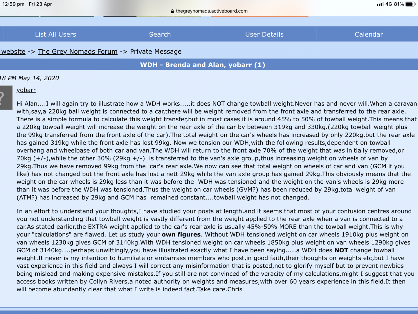 Alan,you are so far lost in the WDH wilderness that I fear for you.Many times,both on the forum and by PM,I have explained to you the workings of a WDH,but still you do not,will not,or cannot understand that a WDH does NOT change towball weight...EVER. To refresh your memory,I have included a screen shot of a PM I sent to you on May 14,2020.Because we have not heard from you of late,I thought that finally you understood the facts. Apparently not? Cheers