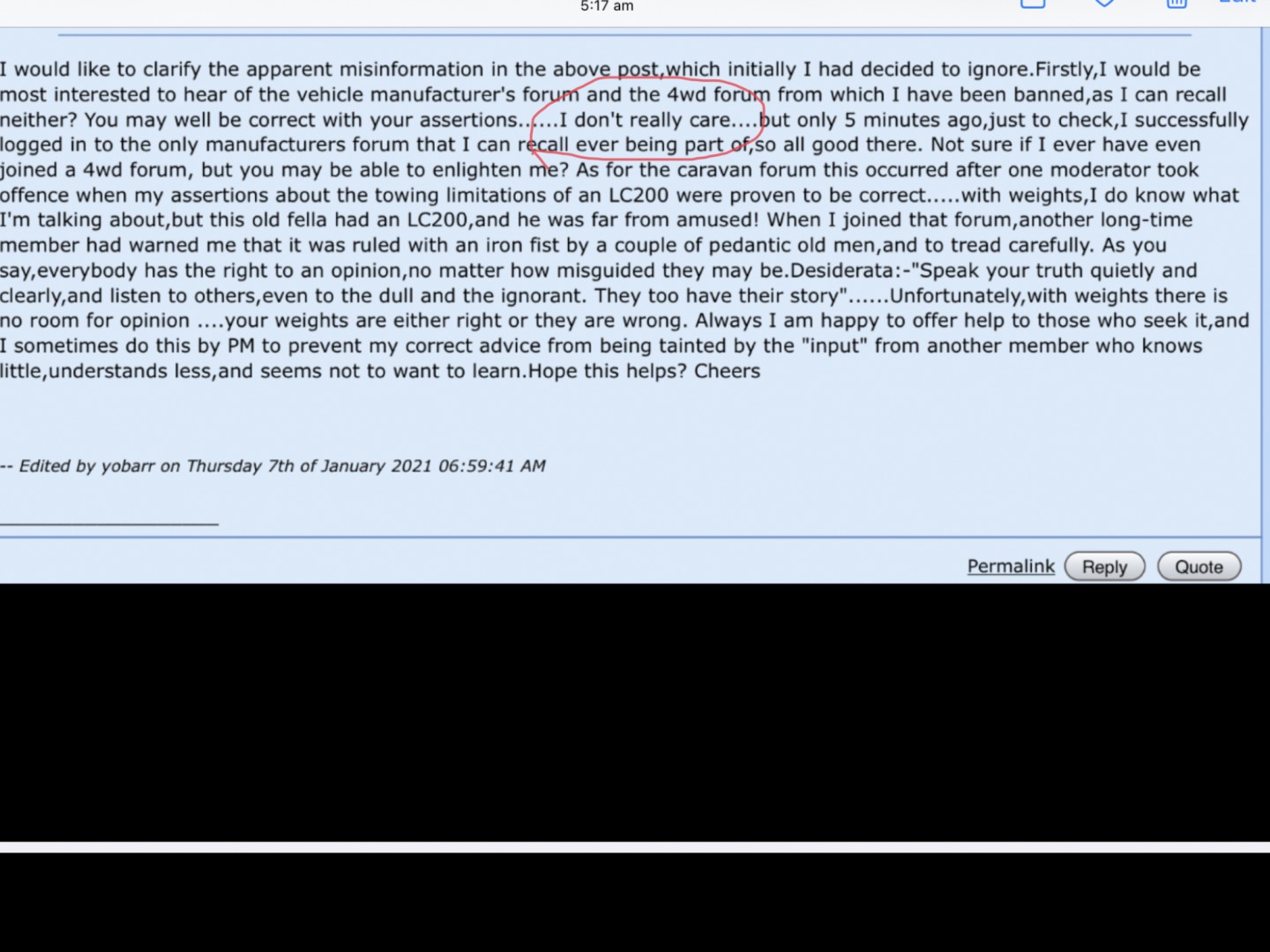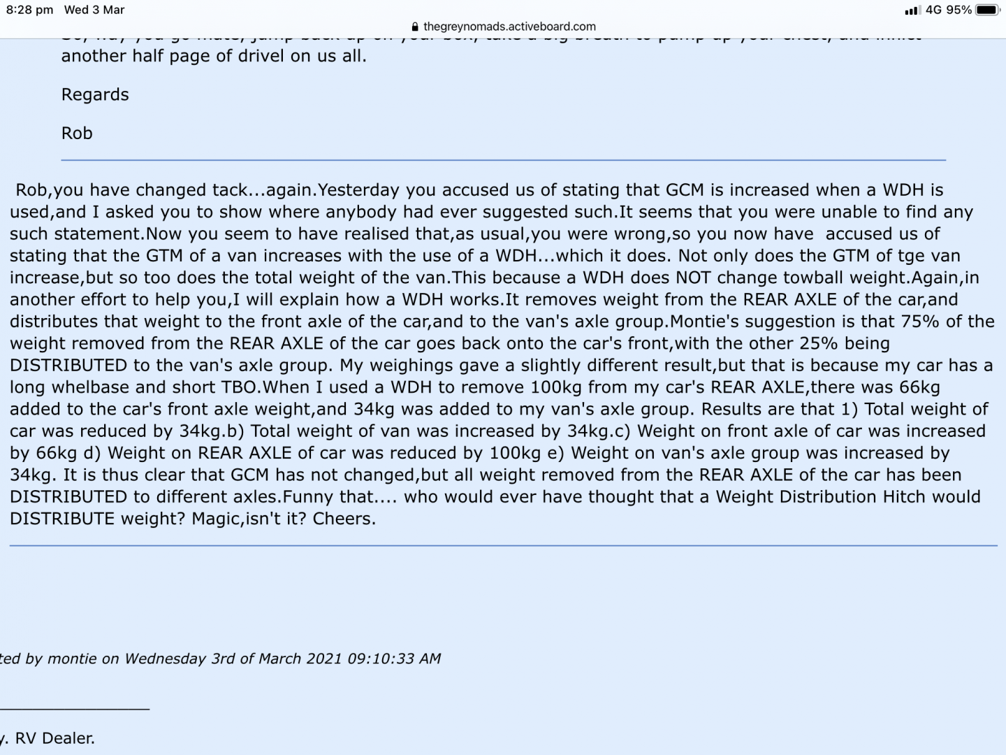 Rob,would you be kind enough to substantiate the claim that I have highlighted in your post above,as you made a similar claim at the start of the year.I have included a screen shot of my response to that original claim,but I can find no record of your reply? What you think about me is of little interest to me anyway,but it would be appreciated if you could offer some evidence to support your unsubstantiated claims. As highlighted in the screen shot,I don't really care. Always I offer advice from experience gained over many years with weights,and always that advice is factual,and easily substantiated. It is of little concern to me that you seem to not understand how a WDH works,and that you have no apparent interest in learning,but I am concerned that the rubbish you post will negatively affect 'newbies',or even current members who simply are trying to broaden their knowledge base,and learn how to tow legally,responsibly and safely.These are the very people I try to help,with much of that help being offered,and gratefully accepted,via PM to avoid unhelpful input from a couple of members who know little,understand less and have no apparent interest in learning.Have a nice day.Cheers