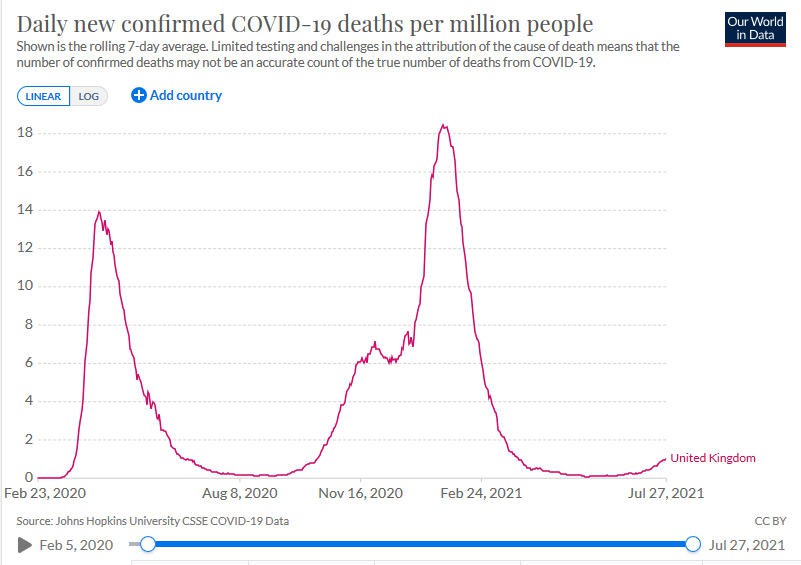 Plain Truth, it would be plainer for others to see if you posted a current graph rather than one 9 months old and before any vaccines. The position at present is very different. Despite the rise in cases, the chance of death from COVID in the UK at present is less than one in a million of population. And the number of cases is falling again despite removal of most restrictions. There are still various recommendations for protection.