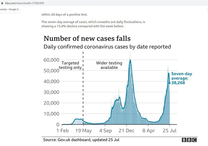 Plain Truth, it would be plainer for others to see if you posted a current graph rather than one 9 months old and before any vaccines. The position at present is very different. Despite the rise in cases, the chance of death from COVID in the UK at present is less than one in a million of population.And the number of cases is falling again despite removal of most restrictions. There are still various recommendations for protection.