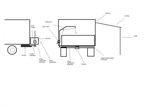 Hi shadow, dont worry about the fluff up we dont care who gets the praise or otherwise, the swing out tyre spare tyre contraption would be quite good but I think an overkill for a pushbike, all that is needed is 50mm x 50mm square steel section welded in to an arch shape with say a small winch off a boat trailer mounted at the base with the cable running to a pulley at the top and down to a hook that you attach to your bike, the other end you make pivot off a bar that you extend off the drawbar under your box and that way you can make the whole thing sit flat against the box and fasten it appropriately. the awnings, what I meant was to make / buy a canvas awning the full length of the vehicle, you mentioned that you had a sail track on the side already, you could leave it on and roll it up into a bag that you leave on the vehicle or slide it off. I will try and make a diagram of the box and lifting mechanism for you to visualise it easier. if i make one person laugh then I am a happy man two and my job is done