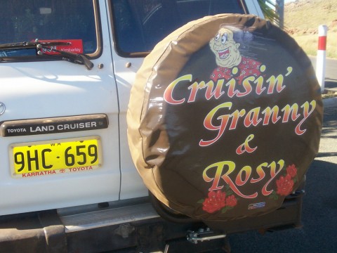 I've had some expressions of interest in my "Cruising Granny" pic. I had them made in Broome. A local printer did the graphic design, printed it on banner vinyl, and the local upholsterer sewed them on to ordinary wheel covers. The print has been exposed to the elements for almost 2 years, and barely show any signs of wear and tear. The concept was my idea, and the printer made it work. Granny's head was hand designed because there are no granny head graphics on the printer's programme. You too can personalise you car and van if you're so inclined. I have 2 spares on the back of the van. Rosy is my "truck". Granny