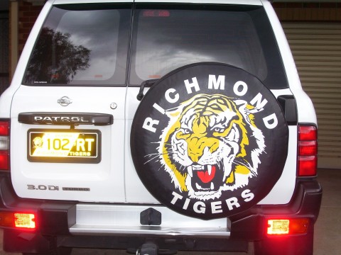 I had them made in Broome. A local printer did the graphic design, printed it on banner vinyl, and the local upholsterer sewed them on to ordinary wheel covers.