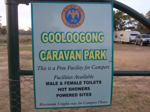 But as for the Gooloogong camp site, all we can say is, it's the best free camping site we've been to so far. Was intending to stay for a day but stayed 3 days! Hot showers, BBQ , good water and 4 powered sites absolutely FREE. However there is an honour box and with facilities like this we certainly don't mind making a donation. And the town is a credit to the people who live there, there's obviously a lot of community pride in the place, clean, safe and very helpful local people. One of the reasons we try and avoid the cities and larger towns.