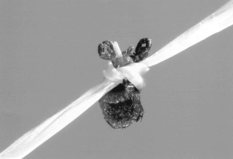 Don't get too excited if the head gets left behind, the body will soon expel it or try the Knot technique. A simple open overhand knot is placed in suitable thread. Suture material such as 1/0 or 0 silk (which naturally every GN has in his/her surgical kit), dental floss, or any thick cotton thread (including unwanted stitching from garments, if nothing else can be found) can be used . The open knot is placed over the tick as close as possible to the skin surface and then gently closed to form a loop around the parasite. Firm traction, lifting the body of the tick over its head in a somersault-type fashion then removes the tick. the Pic demonstrates the knot around a removed tick using dental floss. This method is effective, as the thread naturally inserts between the tick podosoma and gnathosoma and allows the removal of the entire tick, including mouth parts, without damage. This technique is simple, effective, safe for the patient, tick, and environment, and generally requires no additional equipment to be specifically carried for this purpose.
