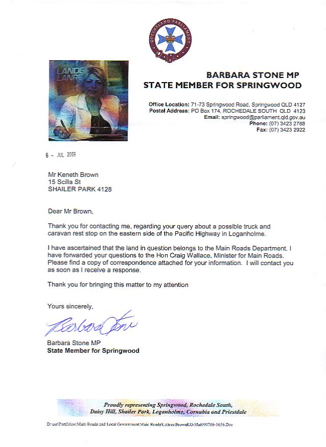 i would like to ask all grey nomads,to support, this project. if you could write a e-mail to my member of parliment,and, the minister of main roads. barbara stone the state member for springwood,gave me a very good hearing with my submission,and she thinks that we can get this site opened up for a rest area. she has written to the main roads minister ( see attached letters ) and has also spoken to him on the phone. at this stage we are waiting for a reply. my local councillor darren power has written a letter of support to the M.P.and the minister. he will try to bring this before the logan city council,to see if they can also send letters of support. i have approached the "driver reviver" people to also see if they can help ( the driver reviver are part of the dept of transport ) in my submission i asked the rest area be called "the grey nomads rest area" ( i thank our webmistress for agreeing to this )