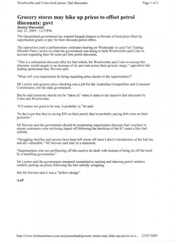 margaret went shopping today at woolies at the logan hyperdome, ( coles and woolies are offering 10 per cent off to pensioners on tuesday and wednesday ) " but" the prices on all the staple lines has shot thru the roof. there other offer is 40 cents off your petrol ( if you buy $300.00 worth of grocereys,etc etc etc etc ) these monopolies just seem to do as they please. is this only happening in queensland
