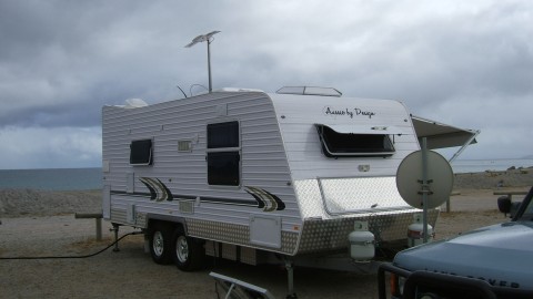 We headed off Friday afternoon for rapid bay with the new van and car. Anybody who knows the road to cape jervis will appreciate it is a challenging trip with lots of windy steep hills. I was a little bit disappointed in the way the new tug handled the conditions but thought maybes i was driving a little cautiously so on the way home drove a bit more aggressively and the tug performed heaps better. very happy with the van, a few little things I need to change but that is to be expected. the camp site at rapid bay as expected was very busy but surprisingly quite. Weather was a bit dodgy saturday morning but then cleard up and was very pleasant thereafter. have attached a few pictures of the van at the camp ground.