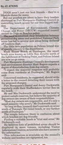 It would appear that between the National Parks Association (supposedly a non government body Ha Ha Ha ) and the NSW National Parks a legitimate government body now in some smke and mirrors dea are l under the control of the DECCW ( Department of Environment Climate Change and Water ) there are firm plans to ban dogs from beaches and the Hastings Council is shaping up as the testing ground for the changes in beach policy