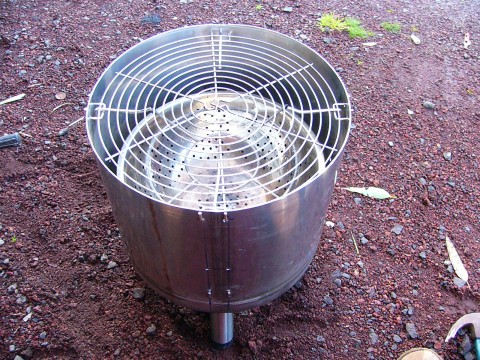 Built another removable grate for the top and hung it on four S/S butchers "S" hooks so it sits inside the fire box and takes my S/S bucket of water for a warm shower