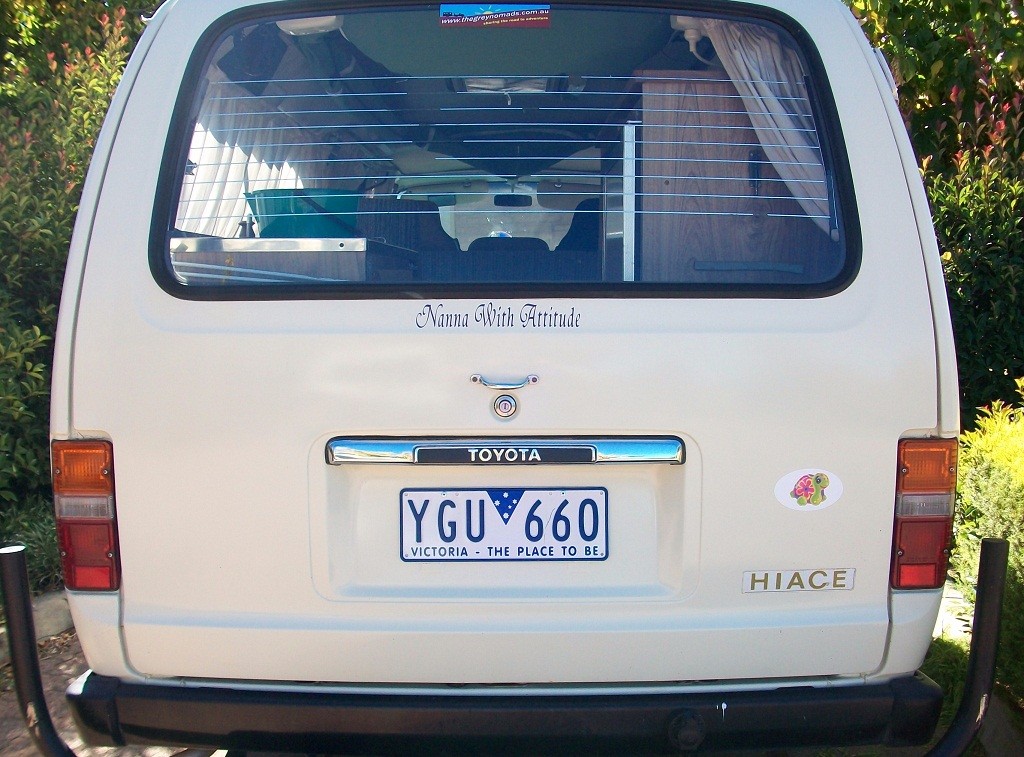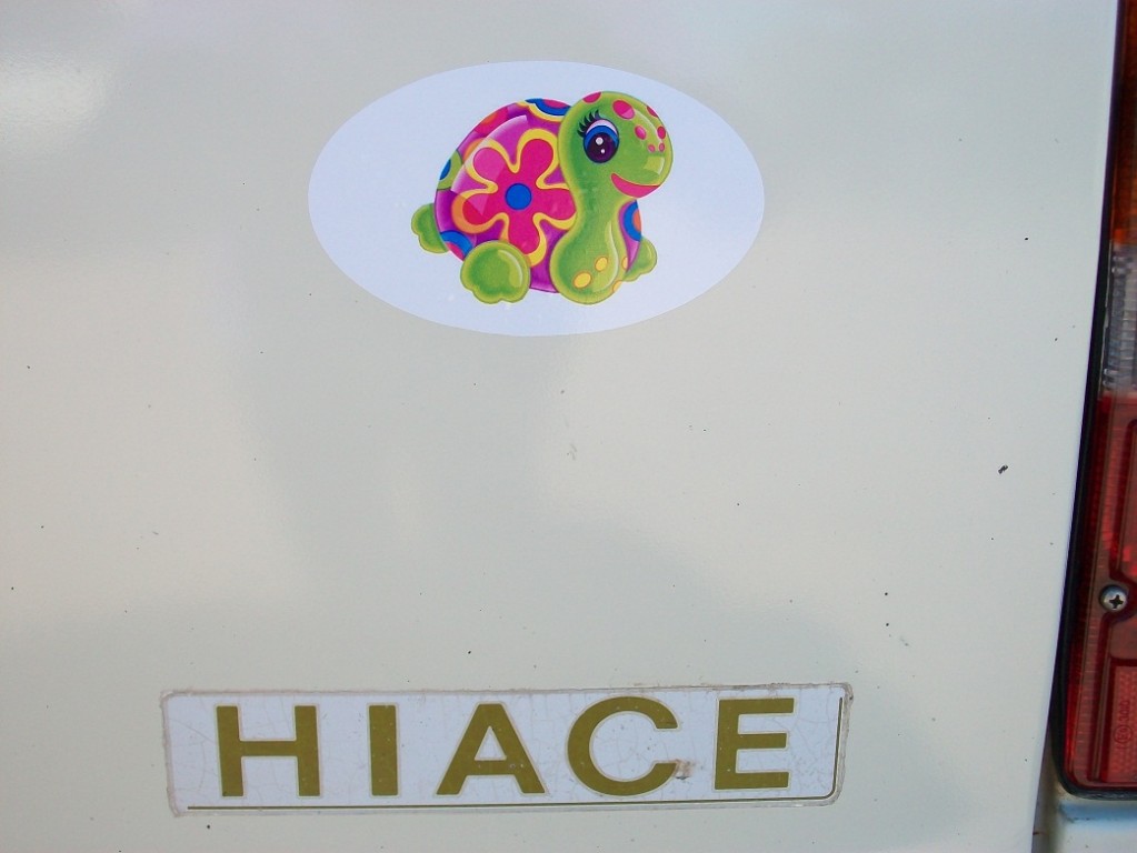 These are Myrtles stickers, some you have seen, some are new and the Happy Wanderer one yet to put up, probably above the front windscreen. Got the turtle and Happy Wanderer stickers from CafePress which is an american company. Very reasonable prices.