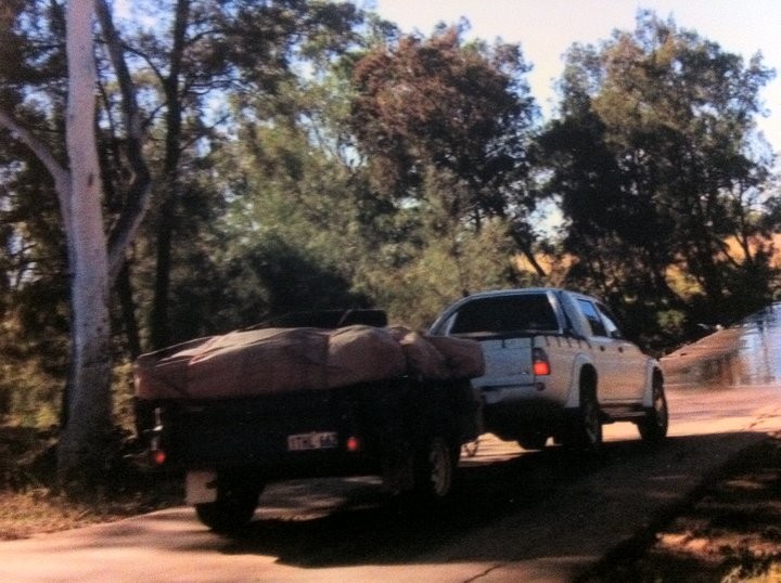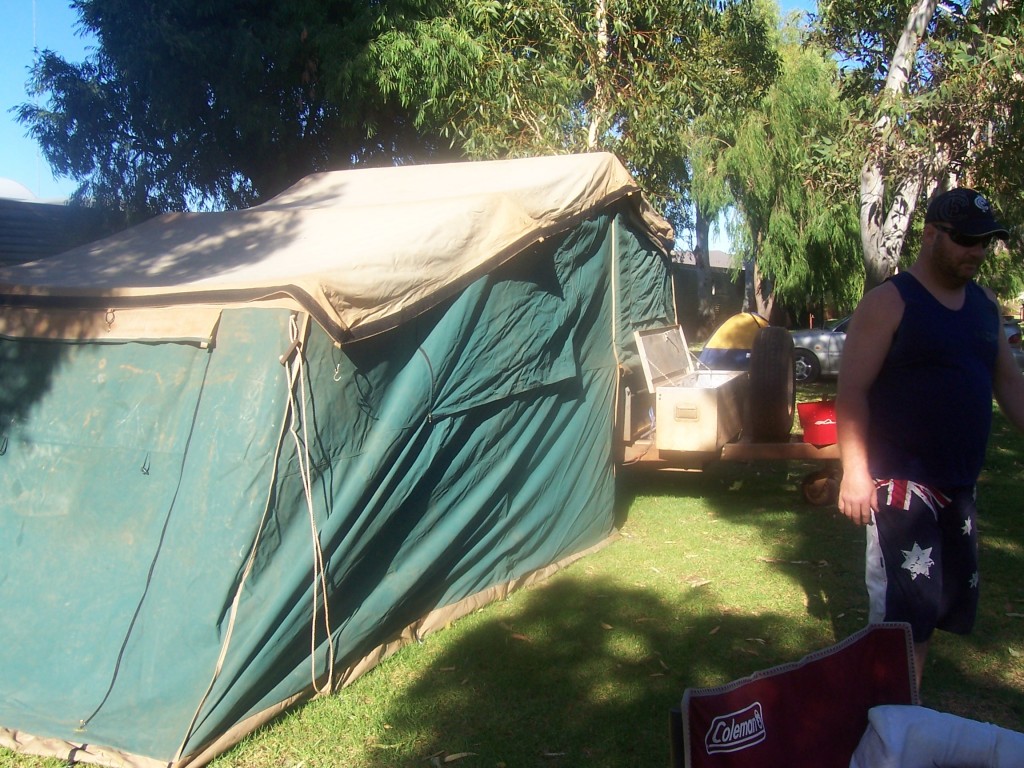 Here is one pic of the stolen camper folded out, another will be obtained of the camper folded down later. Nat is ony new to this and I have explained to her about using caps, so please be tolerant. I understand that the canvas on this camper trailer is very heavily stained in red mud/dust now which would not come out.