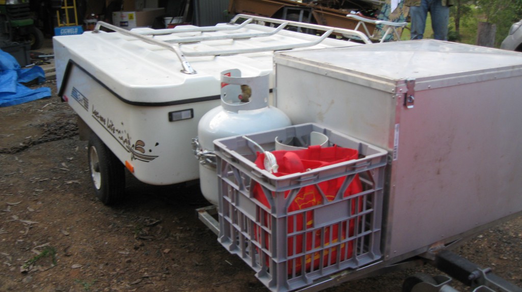 He had to stregthen the draw bar, make the box to suit, and attach the bracket for the gas bottle which will run the fridge when I'm stopped. He also added a crate to carry the small gas bottle, guy ropes etc. I can easily lift this 2kg bottle out to attach to the stove.
