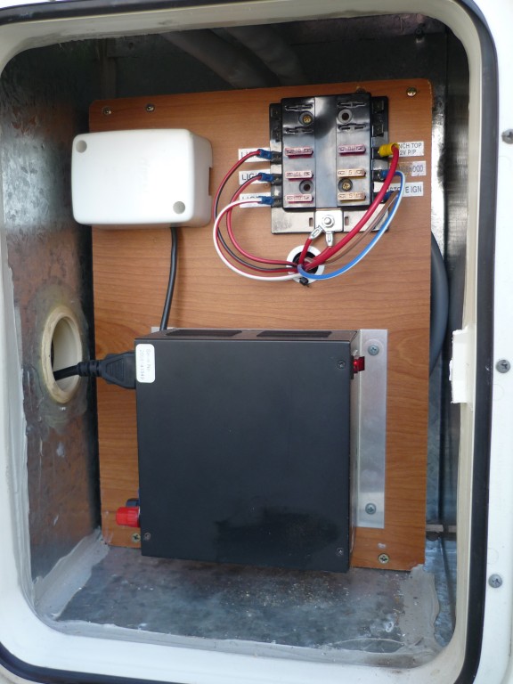Written on the side of a small black box is WALKI ELECTRONICS. Above that is a series of 6 or 8 fuses. There is an ON/OFF switch at the side which is set to ON. The black box is warm, but not hot. I will try to attach a photo.