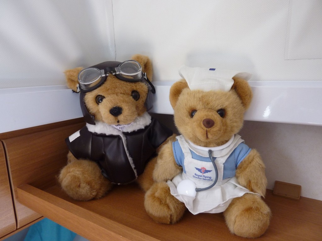 The Bears are nice and quiet, and stay in our caravan. Pilot Bear is a fundraiser for the Southcare Rescue Helicopter, and Nurse Bear from RFDS.