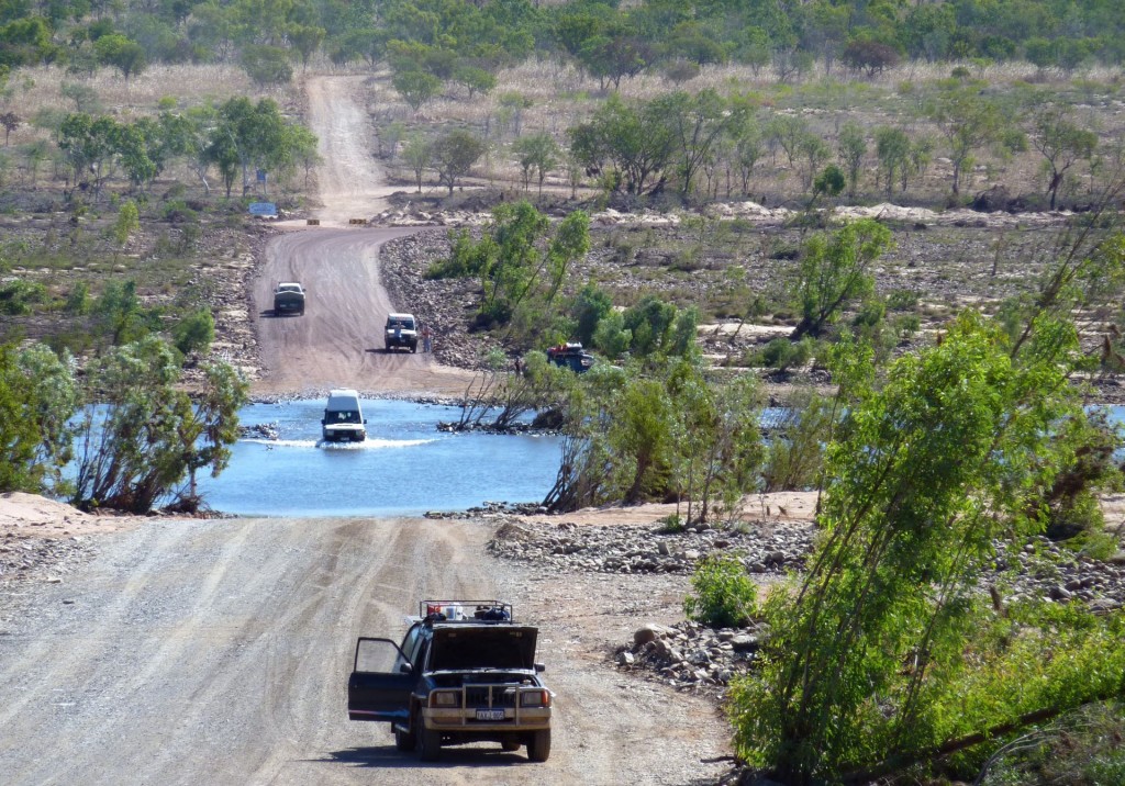 We went out from El Questro to have a look at this river crossing. Plenty of traffic as you can see, and we didnt know why the bonnet was up on that vehicle, as they said they didnt need any help.