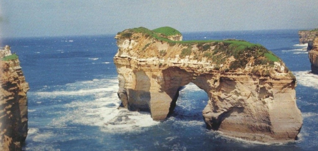 It looks like London Bridge and The Twelve Apostles on The Great Ocean Road in Vic. Thats why I think it has been doctored. There were no bridges between them when I saw them.