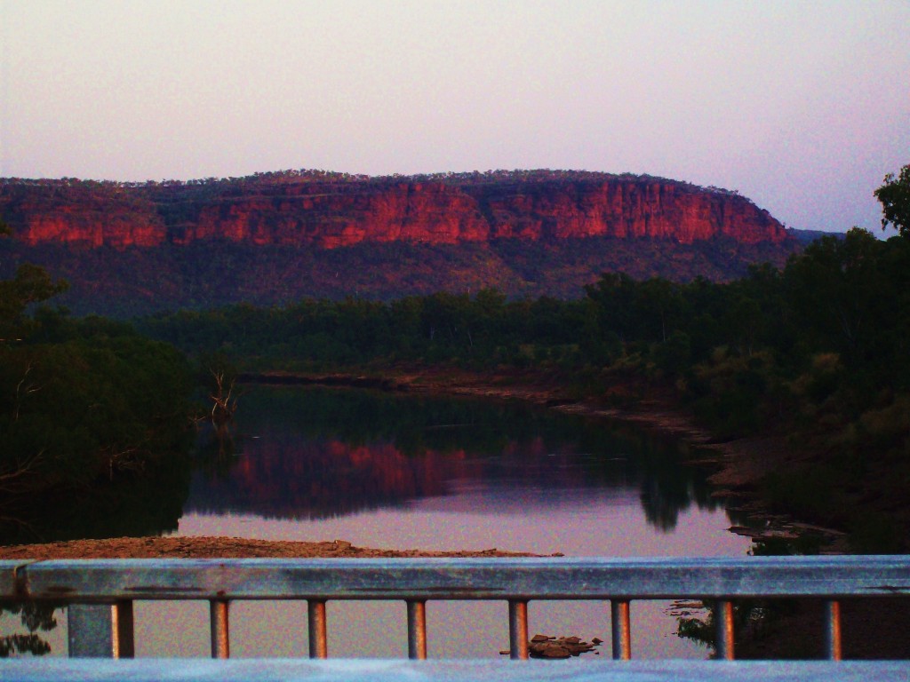 We were lucky enough to be Grey Nomadding at Batchelor NT, working at the local airsrtip. We had the opportunity to fly to Kununurra with the boss, and got to drive his ute back to Batchelor. What a terrific opportunity for us to have a free flight over part of one of the most remote areas in Aus, and then as a bonus to drive back in awesome wonder of the surrounding landscape. Spent a night at Victoria River Roadhouse, and crossed the river early enough to catch the beautiful colours of the sunrise on the escarpment and the reflection in the water.