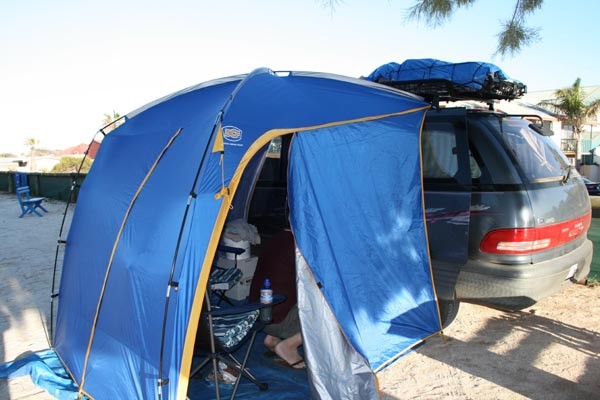 Thought I would show you our old set up we used for our trips.... I think the coaster will be more roomy but somehow I see me missing my car.. it took minutes to set up camp or get ready to take off... is an AWD altho it has a 4wd badge in the back... we had it lifted as far as we could for more clearence.. got one of those side tents for sitting n cooking... had the whole back area as a bed with storage underneath.. its an 8 seater.. and a rack ontop for extras... the dvd player n laptop came with us as well as a cooler.. any way here are some photos