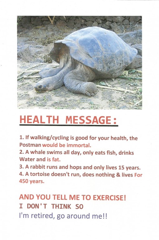 My dad and I have a theory: you only have so many heartbeats in a life - if you exercise, you'll use them quicker and die younger, so why exercise? How often do you hear of really fit people just dropping dead?!!!