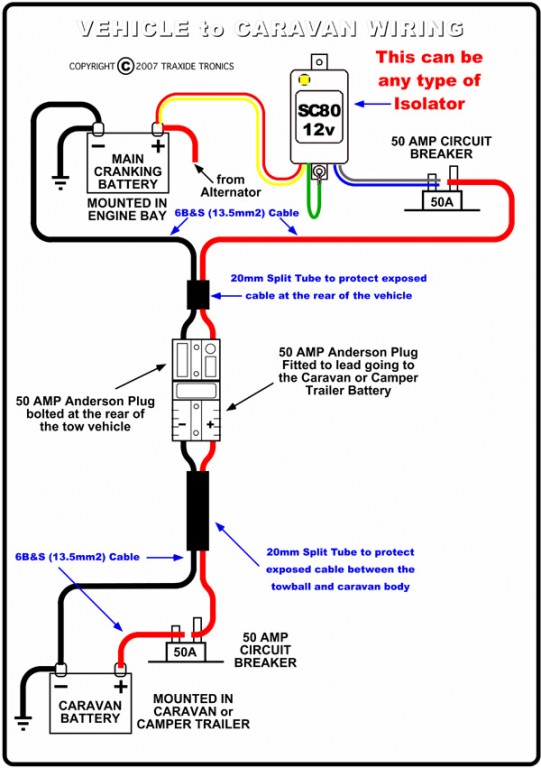 We have Anderson plugs and 6ml cable from the car to van. It's parallel to the battery and runs a fridge. Van is Jayco Freedom pop top.