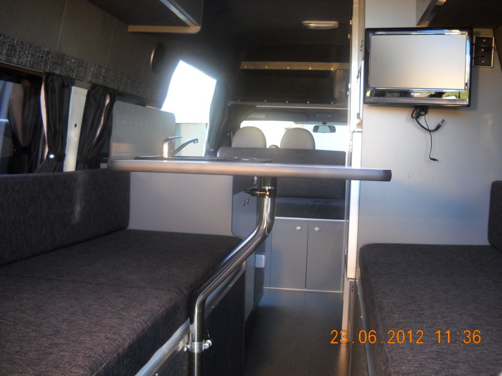 Although it was a homemade fit out, it was done reasonably well, had two single beds at rear, and at a reasonable level, microwave, fridge, sink and bench so no bending. Also good cupboard space, one with pull out wire baskets. Had been fully lined. I would have liked to have seen an aircon in it but it had none, but for the price it seemed a good buy even if it had to be fitted later. Also had a roll out awning.
