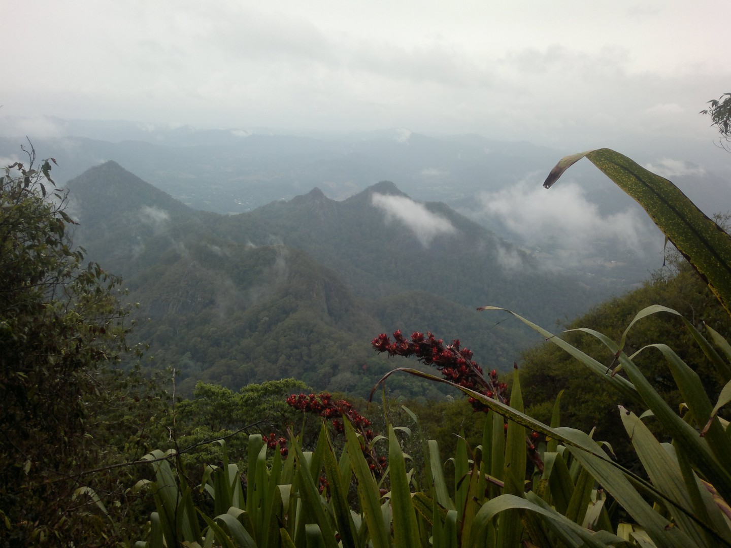 Took this shot from my phone and not until I looked on the computer was it noticable that a water frop was on the end of the long leafs of the giant lily. Taken in November 2012. The walk to the top was about two hours and it was cloudy and rainy at the top. The view was obscured but breathtaking.