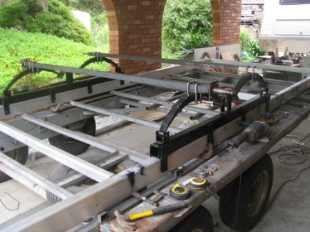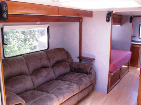 Not sure how this goes, so I will just get to it. My husband built this caravan from the chassis up. All aluminum framing, chassis and such. There are 2 slideouts oppsoite each other in the lving areas, making it roomy for the 2 recliners and the 3 seater lounge. There is a shower and toilets. Kitchen bench is higher than normal due to our heights. The 2 singles beds are also high but only to take advantage of more drawer storage underneath. The single beds are unusual in that one slides across for times of intimacy as required!